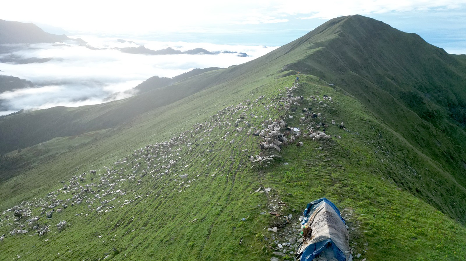 पूर्वी रुकुम, बागलुङ र म्याग्दी जिल्लामा फैलिएको ढोरपाटन सिकार आरक्षको समुन्द्र सतहदेखि चार हजार मिटर उचाईको गर्पाछेडाको डाँडामा रहेको भेडा गोठ । म्याग्दी, बागलुङ, पूर्वी रुकुमका किसानले पशुलाई पोसिलो घाँस खुवाउन ढोरपाटनको बुकी पाटनमा लगेका छन् । तस्बिर ः सन्तोष गौतम / रासस