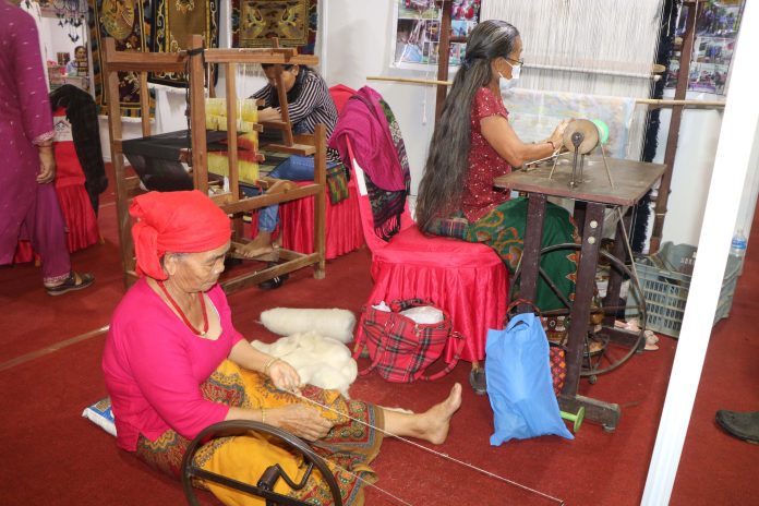 चितवनको भरतपुरमा शुक्रबारबाट सुरु भएको चितवन एक्स्पो सेन्टरमा दोस्रो तीज विशेष उद्यमशील एक्स्पो तथा व्यापार मेलाको स्टलमा उनबाट धागो कात्दै तथा कपडा बुन्दै गरेका बि.एम. हस्तकला प्रशिक्षण उद्योग कालिका नगरपालिकाका–२ का महिलाहरु । तस्बिर : सनद अधिकारी/रासस