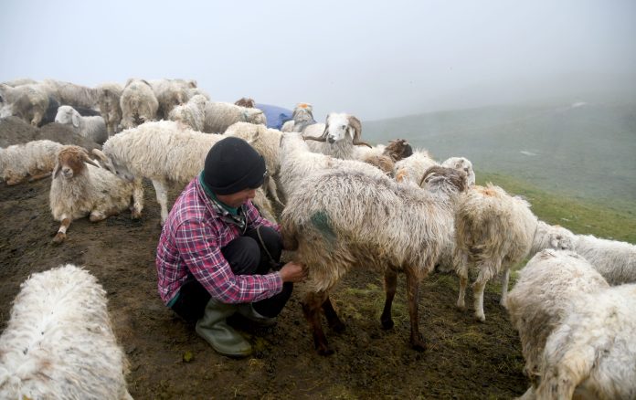 चार हजार ५८० मिटरको उचाइमा अवस्थित रुकुम पूर्वको पुथा उत्तरगङ्गा गाउँपालिकाको माजिलामा रहेको भेडीगोठमा भेंडाको दूध दुहुँदै भेडीगोठाला । उनीहरु भेडाको दूध, दही र खुवा खानाको रुपमा प्रयोग गर्छन् भने घिउ विभिन्न रोगहरुको औषधिको रुपमा प्रयोग हुने भएकाले महङ्गोमा बिक्री गर्छन्। तस्बिरः कुलदीप न्यौपाने/रासस