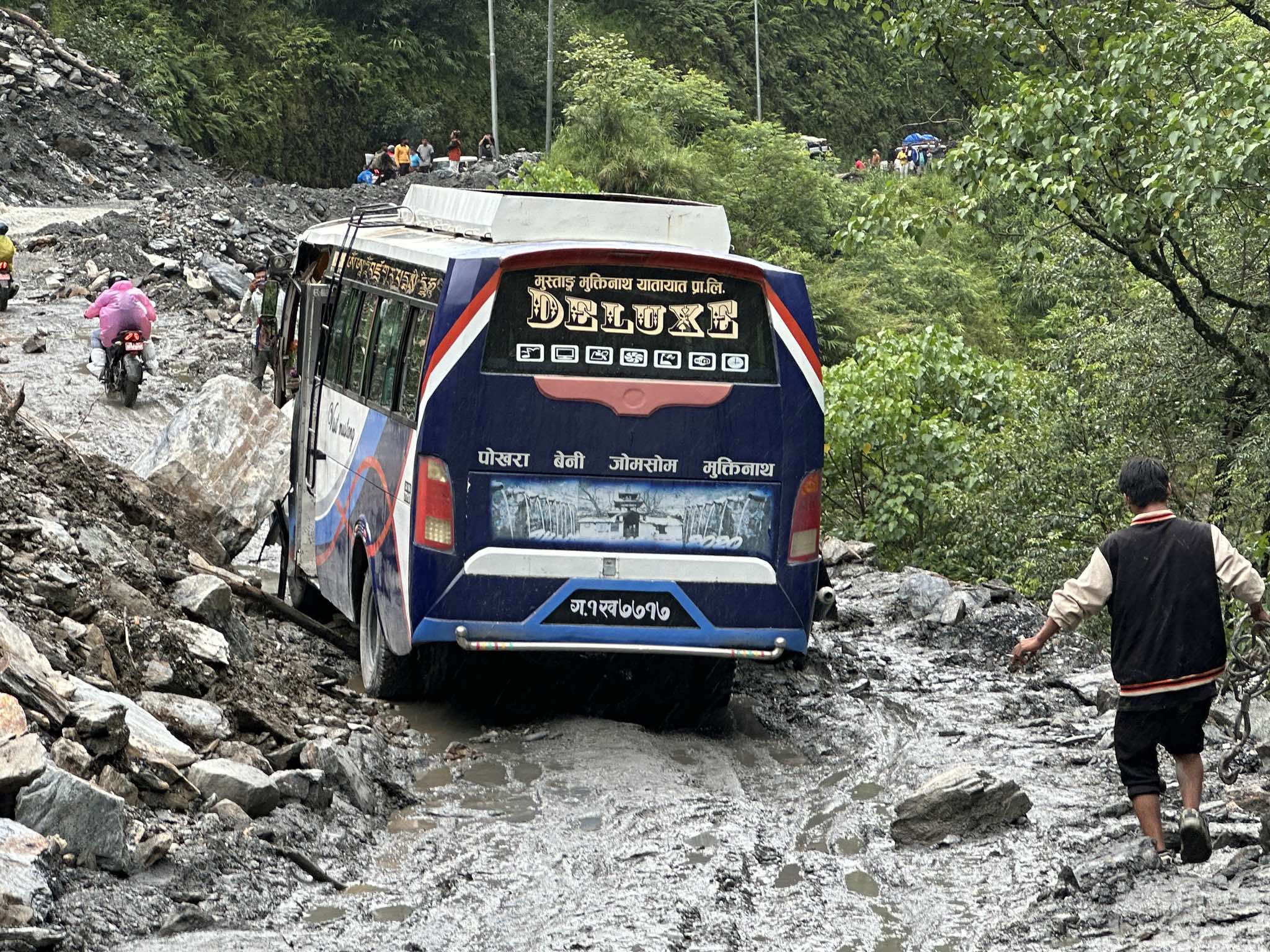 म्याग्दी, १२ भदौः चीन र भारत जोड्ने राष्ट्रिय गौरवको बेनी–जोमसोम–कोरला सडकअन्तर्गत म्याग्दीको रघुगङ्गा गाउँपालिका–२ सिरुबारी क्षेत्रको पहिरोले दुर्घटनाको जोखिम बढेको छ । कालीगण्डकी किनारको पाखोमा निर्माण भएको सडकमा खस्ने पहिरोका कारण बेनी–जोमसोम सडकमा नियमित यातायात सञ्चालन प्रभावित हुनुका साथै दुर्घटनाको जोखिम बढेको हो । स्तरोन्नतिका क्रममा रहेको बेनी–जोमसोम–सडक आयोजनाका सबइन्जिनियर सोहनजङ्ग कार्कीले गत वर्षदेखि सृजना भएको सिरुबारीको पहिरोले दुःख दिइरहेको बताउनुभयो । “करिब एक किलोमिटरमाथिको पाखो बगेको छ”, उहाँले भन्नुभयो “खसेको पहिरो पन्छाउदै सावधानी अपनाएर यातायात सञ्चालन गरिएको छ ।” आकाशबाट पानी पर्नेबित्तिकै पाखोबाट ढुङ्गा, लेदो र गेगरसहितको पहिरो खसेर सडकमा थुप्रिन्छ । हिलोमा सवारीसाधन फस्ने, गुुडिरहेका सवारीमाथि ढुङ्गा खस्ने, यात्रीलाई चोटपटक लाग्ने जोखिम छ । यही भदौ ४ गते पोखराबाट बेनी हुँदै जोमसोमतर्फ जाँदै गरेको ग१ख ७७१७ नम्बरको बस सिरुबारीको पहिरोमा गुडिरहेको अवस्थामा ठूलो ढुङ्गा खसेर च्यापिदा दुईजना यात्रा घाइते भएका थिए । पहिरोले सयौँ रोपनी खेतीयोग्य जमिन र जङ्गल नष्ट भएको छ । सवारी चालक तम परियारले त्रासैत्रासमा गाडीलाई पहिरो पार गर्नुपर्ने बाध्यता रहेको बताउनुभयो । सिरुबारी क्षेत्रमा करिब पाँच सय मिटर सडक पहिरोले छियाछिया बनाएको छ । मुस्ताङ जिल्ला, म्याग्दीको अन्नपूूर्ण गाउँपालिकाका बासिन्दाका साथै पर्यटक र तिर्थयात्रीलाई पहिरोका कारण जोखिम र सास्ती भएको छ । सिरुबारी, महभिर, बैसरी, गुइँठेभिरलगायत ठाउँमा पहिरोको उच्च जोखिम भएकाले रातको समयमा यात्रा नगर्न र सावधानी अपनाउन जिल्ला प्रशासन कार्यालय, रघुगङ्गा, अन्नपूूर्ण गाउँपालिका र बेनी–जोमसोम–कोरला सडक आयोजनाले अपिल गरेका छन् । ती ठाउँमा खस्ने पहिरो पन्छाएर यातायात सञ्चालन गर्न सडक विभागको डोजर, लोडर, ब्याकुहोलोडर तयारी अवस्थामा राखिएको बेनी–जोमसोम–कोरला सडक आयोजनाका प्रमुख धु्रवकुमार झाले बताउनुभयो । पहिरो, कटान र बाढीको जोखिम भएको ठाउँमा दीर्घकालीन समाधानका लागि अध्ययन गरेर भौतिक पूर्वाधार विकास तथा यातायात व्यवस्था मन्त्रालयमा योजना माग गरिएको उहाँले बताउनुभयो । योजना र बजेटको अभावमा पहिरो रोकथामका लागि दीर्घकालीन काम गर्न नसकेको झाले बताउनुभयो । –––