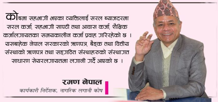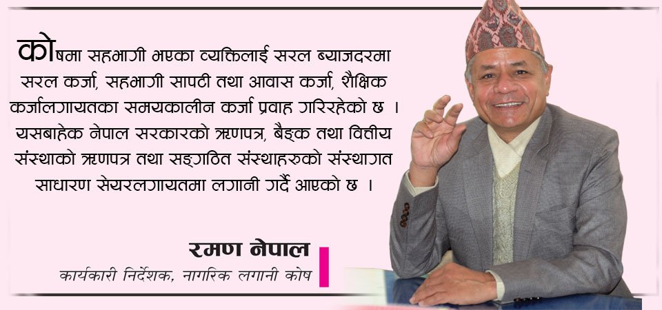 कार्यकारी निर्देशक, नागरिक लगानी कोष काठमाडौँ, ९ असोज (रासस)ः वित्तीय क्षेत्रमा लामो अनुभव सम्हाल्नुभएका पर्वतकुमार कार्की नेपाल राष्ट्र बैङ्कमा तीसवर्षे सेवा पूरा गरी कार्यकारी निर्देशकबाट सेवा निवृत्त हुनुभएको हो । राष्ट्र बैङ्कबाट सेवा निवृत्त भएपश्चात् कार्कीले साबिकको ग्रामीण विकास बैङ्कको प्रमुख कार्यकारी अधिकृतका रुपमा चार वर्ष र कोषमा आउनुअघि किसान लघुवित्त वित्तीय संस्था लिमिटेडको प्रमुख कार्यकारी अधिकृतका रुपमा कार्य गर्नुभएको थियो । प्रस्तुत छ, कोषका कार्यकारी निर्देशक कार्कीसँग राष्ट्रिय समाचार समिति (रासस)का आलेख प्रमुख कृष्ण अधिकारीले गरेको कुराकानीको सम्पादित अंश । कोषले २९औँ वार्षिक साधारणसभा केही समयअघि सम्पन्न गरेको छ । साधारणसभाले के सन्देश दिएको छ ? कोषले हालका वर्षमा साधारणसभा नियमित रुपमा गर्दै आइरहेको छ । आर्थिक वर्ष २०७९÷८० को वार्षिक साधारणसभा असार मसान्तभित्रै सम्पन्न गरेको छ । यो कोषको २९औँ साधारणसभा हो । साधारणसभाले १४ प्रतिशत बोनस शेयर र कर प्रयोजनको लागि ०.७३६८ प्रतिशत नगद लाभांश पारित गरेको छ । कोषको ३३ वर्षको इतिहास सन्तोषजनक रहेको छ । कोषले नियमित रुपमा आफ्ना शेयरधनीहरुलाई उचित प्रतिफल दिँदै आएको छ । एक करोड ४४ लाखको चुक्ता पुँजीबाट स्थापना भएको कोषको पुँजीमा धेरै ठूलो वृद्धि भएको छ । कोषले आव २०७९÷८० वितरण गरेको बोनश शेयरपश्चात कोषको चुक्ता पुँजी छ अर्ब पाँच करोड रुपैयाँ पुगेको छ । अहिले कोषले के कस्ता योजनाहरु सञ्चालन गरिरहेको छ ? कोषले अवकाश कोष व्यवस्थापन तथा सामाजिक सुरक्षाका सम्बन्धमा विगतदेखि नै काम गर्दै आइरहेको छ । कोषले सञ्चालन गरेका कार्यक्रमरुमा कर्मचारी बचत वृद्धि अवकाश कोष, नागरिक पेन्सन योजना, उपदान कोष, लगानीकर्ता हिसाब योजना, बीमा कोषलगायतका योजना रहेका छन् । कोषले साना तथा मझौलास्तरका बचतकर्ताहरुको बचत परिचालन गरी अधिकतम प्रतिफलको अवसर प्रदान गर्ने उद्देश्यका साथ कर्मचारी बचत वृद्धि लगायतका योजना सञ्चालन गरेको छभने सार्वजनिक संस्थान र अन्य सङ्गठित सङ्घसंस्थालाई आफ्नो दीर्घकालीन दायित्व व्यवस्थापनका लागि क्रमिक रुपमा कोषमा रकम जम्मा गर्न प्रोत्साहित गर्ने, सरकारी क्षेत्रका साथै अन्य क्षेत्रमा समेत सामाजिक सुरक्षा प्रदान गर्ने लगायतका कार्य गर्दै आइरहेको छ । यसका अतिरिक्त आम नेपाली नागरिकलाई समेट्ने गरी नागरिक पेन्सन योजनासमेत सञ्चालनमा ल्याएको छ । साथै, पुँजी बजारको विकासमा सघाउ पुग्नेगरी पुँजी बजारसम्बन्धी विभिन्न गतिविधिहरुमा समेत कोष संलग्न रहेको छ । सहभागीलाई दिने सेवालाई कसरी चुस्त राख्नु भएको छ ? कोषले आफ्नो सेवालाई प्रभावकारी बनाउन यान्त्रिकीकरणम