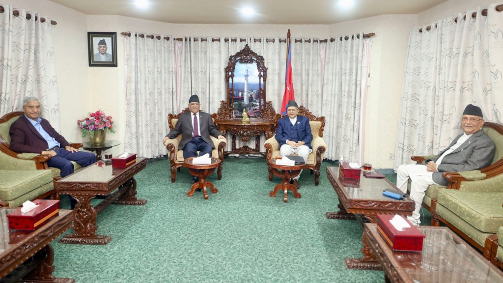 काठमाडौँ, १ कात्तिकः प्रधानमन्त्री एवं नेपाल कम्युनिष्ट पार्टी (एमाले) का अध्यक्ष केपी शर्मा ओलीसहित तीन दलका शीर्षनेताको बैठकमा शान्ति प्रक्रियाको थप कामलाई अघि बढाउने विषयमा छलफल भएको छ । प्रधानमन्त्री निवास, बालुवाटारमा आज बसेको बैठकमा शान्ति प्रक्रियाको बाँकी काम टुङ्ग्याउने विषयमा छलफल भएको, शान्ति प्रक्रियाको भावना र कानुनी प्रक्रियालाई बुझ्ने खालका व्यक्तिलाई पदाधिकारी बनाउनुपर्ने विषयमा छलफल भएको नेकपा (माओवादी केन्द्र) का उपमहासचिव शक्तिबहादुर बस्नेतले जानकारी दिनुभयो । “एक÷दुई दिनभित्र सिफारिस समितिलाई पूर्णता दिने विषयमा छलफल भएको छ, सिफारिस समितिले पूर्णता पाएपछि आयोगमा पदाधिकारी सिफारिस हुन्छ”, बैठकपछि उहाँले भन्नुभयो, “शान्ति प्रक्रियाको भावना र कानुनी प्रक्रियालाई बुझ्ने खालका व्यक्तिको आयोग बनोस् भन्ने सबैको चाहना छ तर कस्तो व्यक्ति पठाउने दुई आयोगमा भन्ने कुरा सिफारिस समितिले गर्नेछ ।” सत्य निरुपण तथा मेलमिलाप आयोग र बेपत्ता पारिएका व्यक्तिको छानबिन आयोग गठन गर्न अघिल्लो सरकारले सिफारिस समिति बनाएको थियो । गत भदौ १३ गते राष्ट्रपतिबाट दुवै आयोगसम्बन्धी कानुनलाई संशोधन गर्ने विधेयक प्रमाणीकरण भएको थियो । बैठकमा प्रधानमन्त्री ओली, नेपाली कांग्रेसका सभापति एवं पूर्वप्रधानमन्त्री शेरबहादुर देउवा, प्रमुुख प्रतिपक्षी नेकपा (माओवादी केन्द्र) का अध्यक्ष एवं पूर्वप्रधानमन्त्री पुुष्पकमल दाहाल ‘प्रचण्ड’, गृहमन्त्री रमेश लेखक, नेकपा (माओवादी केन्द्र) का उपमहासचिव बस्नेत र महान्यायाधिवक्ता रमेश वडाल सहभागी हुनुुहुन्थ्यो । —
