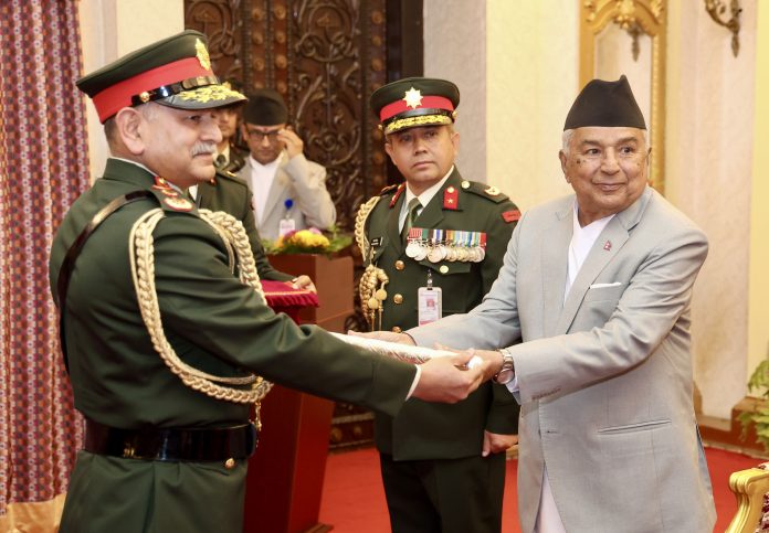 काठमाडौँ, ६ मङ्सिर : राष्ट्रपति रामचन्द्र पौडेलले भारतीय स्थल सेनाध्यक्ष उपेन्द्र द्विवेदीलाई मानार्थ महारथीको दर्ज्यानी चिन्ह तथा खड्ग प्रदान गर्नुभएको छ । नेपाली सेनाका परमाधिपति समेत रहनुभएका राष्ट्रपति पौडेलले आज राष्ट्रपति भवन शीतल निवासमा आयोजित विशेष समारोहबीच उहाँलाई दर्ज्यानी चिन्ह प्रदान गर्नुभएको हो । प्रधान सेनापति अशोकराज सिग्देलको निमन्त्रणामा सेनाध्यक्ष द्विवेदी बुधबार नेपाल आउनुभएको हो । सो समारोहमा उपराष्ट्रपति रामसहायप्रसाद यादव, प्रधानमन्त्री केपी शर्मा ओली, रक्षामन्त्री मानवीर राईलगायत विशिष्ट महानुभावको उपस्थिति थियो । नेपाल–भारतबीचको सैनिक सम्बन्धको निरन्तरता स्वरुप सन् १९५० देखि दुवै देशले एक अर्काका प्रधान सेनापतिलाई मानार्थ महारथीको दर्जा प्रदान गर्ने परम्परा रहिआएको छ । यसअघि भारतका तत्कालीन राष्ट्रपति रामनाथ कोविंदले नेपालका तत्कालीन प्रधानसेनापति प्रभुराम शर्मालाई २०७८ कात्तिक २४ गते भारतीय स्थलसेनाको मानार्थ महारथीको दर्ज्यानी चिह्न प्रदान गर्नुभएको थियो । तत्कालीन राष्ट्रपति विद्यादेवी भण्डारीले २०७९ भदौ २० गते भारतीय स्थल सेनाध्यक्ष मनोज पाण्डेलाई नेपाली सेनाको मानार्थ महारथी पद प्रदान गर्नुभएको थियो । सन् १९५० मा भारतका सेनाध्यक्ष जनरल केएम परिअप्पालाई पहिलो पटक नेपाली सेनाको मानार्थ महारथी प्रदान गरिएको थियो भने २०२६ सालमा तत्कालीन प्रधानसेनापति सुरेन्द्रबहादुर शाहलाई पनि पहिलो पटक भारतीय सेनाको मानार्थ महारथीबाट सुशोभित गरिएको थियो । छिमेकी देशका सेनाबीचको यस्तो सम्मान परम्पराले सम्बन्धलाई सुमधुर तुल्याउन र सौहार्दता कायम राख्न महत्वपूर्ण कडीका रुपमा भूमिका खेल्ने विश्वास गरिएको छ ।