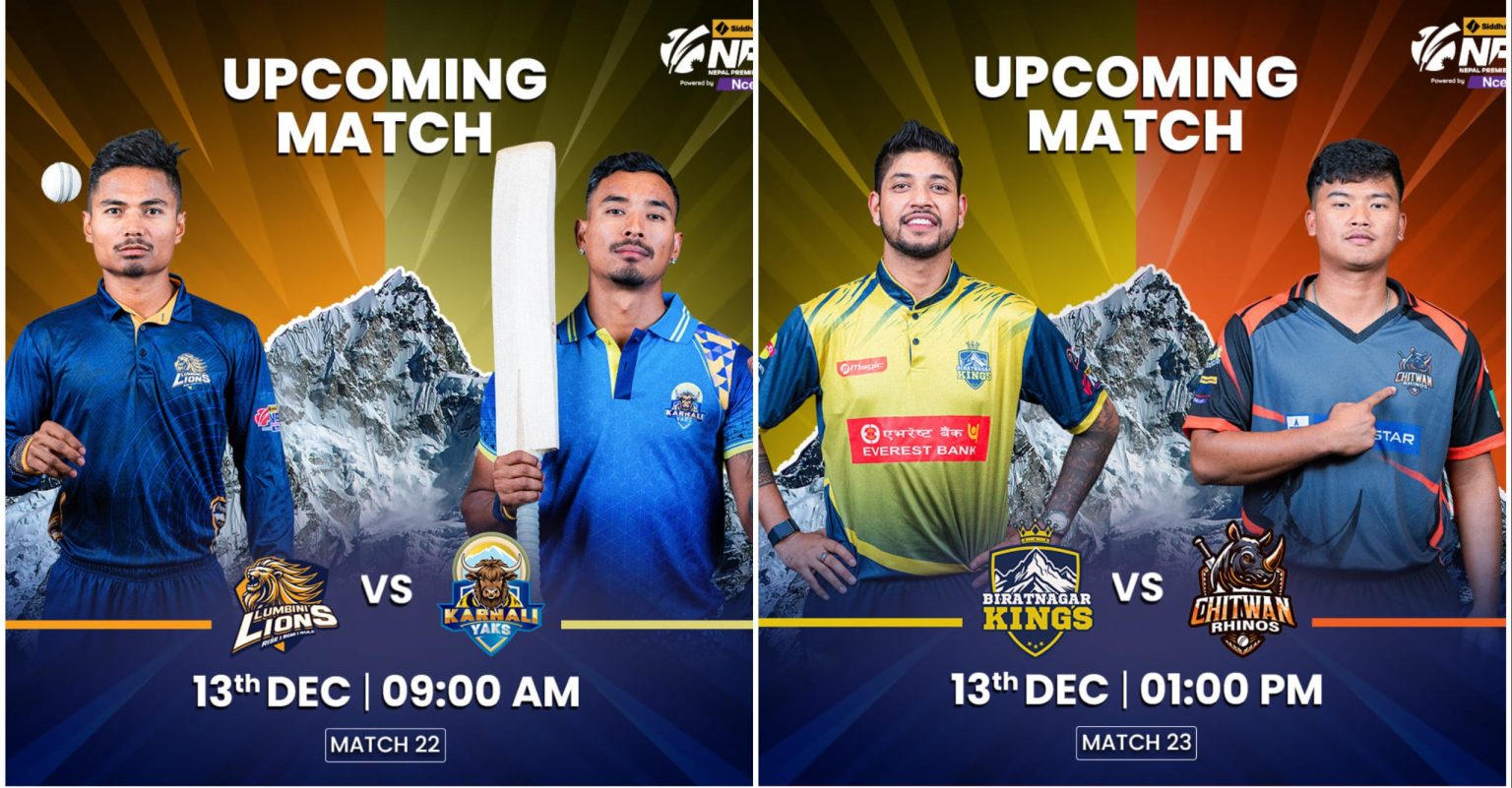 काठमाडौँ, २८ मङ्सिरः कीर्तिपुरस्थित त्रिभुवन विश्वविद्यालयको खेल मैदानमा जारी नेपाल प्रिमियर लिग (एनपिएल)मा आज दुई खेल हुँदैछन् । पहिलो खेल लुम्बिनी लायन्स र कर्णाली एक्स र दोस्रो स्पर्धा विराटनगर किङ्स र चितवन राइनोजबीच हुनेछ । पहिलो खेल ९ः१५ र दोस्रो खेल १ः१५ बजे हुनेछ । –––