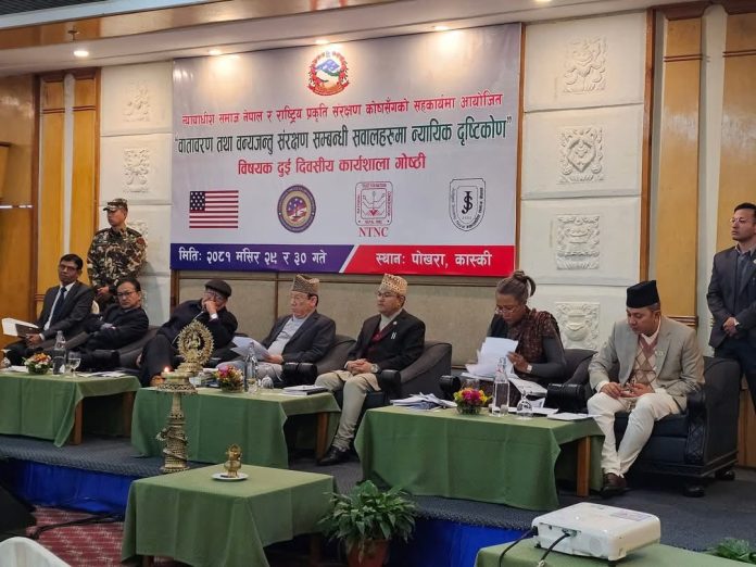 गण्डकी, १ पुसः वातावरण तथा वनयजन्तु संरक्षणमा न्यायपालिकाको भूमिका महत्वपूर्ण हुनेमा जोड दिइएको छ । पोखरामा दुईदिनसम्म चलेको ‘वातावरणीय तथा वन्यजन्तु संरक्षणसम्बन्धी सवालहरूमा न्यायीक दृष्टिकोण’ विषयक कार्यशाला गोष्ठीमा वातावरणीय न्यायको क्षेत्रमा न्यायपालिकाबाट महत्वपूर्ण फैसला गरेको औँल्याइएको थियो । न्यायाधीश समाज नेपाल र राष्ट्रिय प्रकृति संरक्षण कोषद्वारा आयोजित उक्त गोष्ठीमा पोखरा महानगरका प्रमुख धनराज आचार्यले वातावरणको मुद्दा न्यायको विषय भएको बताउनुभयो । विकसित देशहरूले गरिहेको कार्बन उत्सर्जनका कारण नेपालले वातावरणीय क्षति व्यहोर्नुपरेको जनाउँदै नेपालले जलवायु क्षतिपूर्ति पाउनुपर्ने उहाँको भनाइ थियो । गण्डकी प्रदेश सरकारका वन तथा वातावरणमन्त्री भेषबहादुर पौडेलले वातावरण क्षेत्रमा तल्लो तहबाटै न्याय निरुपणको आवश्यकता रहेको बताउनुभयो । उहाँले वन क्षेत्रको जिम्मेवारी प्रदेश तहलाई दिनुपर्ने बताउनुभयो । विशेष अदालतका अध्यक्ष टेकनारायण कुँवरले वन्यजन्तु अपराध संसारको चौँथो ठूलो सङ्गठित अपराध भएको उल्लेख गर्नुभयो । वातावरणीय मुद्दाका विषयमा अन्तर्राष्ट्रिय अदालत हेगमासमेत हाले सम्मेलन भएको र नेपालले जलवायु न्यायको विषय उठाएको उहाँको भनाइ थियो । वातावरण तथा वन्यजन्तु अपराधसँग सम्बन्धित विषयहरूमा न्यायालयले गरेका फैसलालाई सरकारले कार्यान्वयन गरेको जनाउँदै वन तथा वातावरणमन्त्री ऐनबहादुर शाहीले वातावरण संरक्षण सबैको दायित्व रहेको उल्लेख गर्नुभयो । कोषका अध्यक्षसमेत रहनुभएका मन्त्री शाहीले वातावरणीय न्यायका विद्यमान चुनौती र समस्यालाई सूक्ष्म तबरबाट विश्लेषण गरी नीति निर्माणदेखि कार्यान्वयन तहसम्म लैजानुपर्ने बताउनुभयो । उहाँले संसार जलवायु परिवर्तन, जैविक विविधताको क्षय र प्रदूषणको सङ्कटबाट गुज्रिएको बताउँदै यी विषयमा राज्यका सबै निकायको समान बुझाइ आवश्यक रहेको बताउनुभयो । कार्यक्रममा सर्वोच्च अदालतका वरिष्ठ न्यायाधीश सपना प्रधान मल्लले दुई विकसित र औद्योगिक राष्ट्रका बीचमा रहेकाले नेपाल वातारणीय सङ्कटको उच्च जोखिममा रहेको बताउनुभयो । उहाँले वातावरणीय अध्ययन प्रतिवेदनलाई अदालतले गम्भीर दस्तावेजका रूपमा लिने भएकाले उक्त प्रतिवेदनलाई सामान्यरूपमा नलिन आग्रह गर्नुभयो । न्यायाधीश मल्लले संरक्षण र उपभोग गर्दा वातावरणलाई धेरै क्षति गर्न नहुने बताउनुभयो । गोष्ठीमा पूर्वप्रधानन्यायाधीश मिनबहादुर रायमाझीले सिद्धान्तमा आधारित न्याय सम्पादन गर्नुपर्ने बताउनुभयो । आइतबार वातावरणीय न्यायका सवालमा तीनवटा सत्रमा छलफल भएको राष्ट्रिय प्रकृति संरक्षण कोषका सदस्य–सचिव डा नरेश स