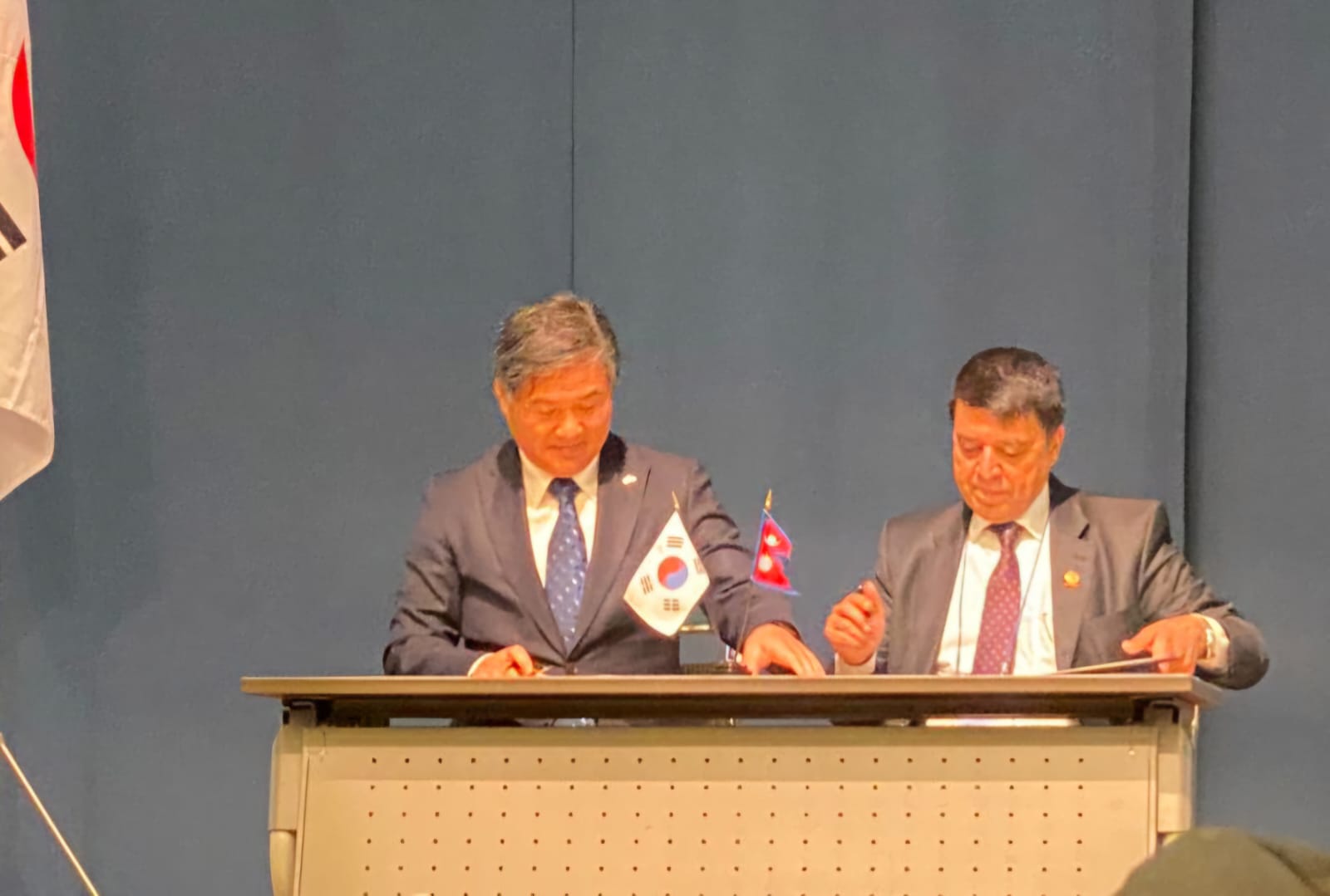 काठमाडौँ, ५ पुस : नेपाल उद्योग वाणिज्य महासङ्घ र कोरिया इम्पोटर्स एशोसिएसन (कोइमा)बीच नेपाली उत्पादनको बजार प्रवर्द्धन एवं लगानी विस्तार गर्ने विषयक समझदारीपत्रमा हस्ताक्षर भएको छ । बिहीबार दक्षिण कोरियाको राजधानी सोलमा आयोजित एक कार्यक्रममा महासङ्घ अध्यक्ष चन्द्रप्रसाद ढकाल र कोइमा अध्यक्ष वुवाङ्ग कुवान किमबीच समझदारीपत्रमा हस्ताक्षर भएको हो । कोइमा दक्षिण कोरियामा औद्योगिक कच्चा पदार्थ र विशेषगरी त्यहाँ उत्पादन नहुने सामान आयात गरी औद्योगिक वातावरण प्रवर्द्धन र सर्वसाधारणलाई सुलभ रूपमा सामान उपलब्ध गराउन स्थापना भएको संस्थाका रूपमा स्थापित छ । आयातलाई नै केन्द्रित गरी स्थापना भएको संस्थासँगको सहकार्यबाट नेपाली उत्पादन कोरियामा विस्तार गर्न सहज हुने महासङ्घको विश्वास छ । यसबाट नेपाल र दक्षिण कोरियाबीचको व्यापार घाटा कम हुने विश्वास छ । हाल दुइ देशबीचको व्यापार घाटा करिब रू सात अर्ब बराबर छ । नेपालबाट हाल फेल्ट, गलैँचा, धागोलगायत परम्परागत सामान बढी गइरहेको सन्दर्भमा कोइमासँगको सहकार्यबाट औद्योगिक कच्चा पदार्थ एवं अन्य सामानका लागि पनि बजार खोज्न सकिने महासङ्घको विश्वास छ । नेपाल–कोरिया दौत्य सम्बन्ध स्थापनाको ५० वर्ष र समझदारीपत्रमा हस्ताक्षर गर्न आयोजित कार्यक्रममा महासङ्घ अध्यक्ष ढकालले नेपाल र कोरियाबीच आर्थिक सम्बन्ध सुदृढ गर्न सकिने अपार सम्भावना रहेको वताउनुभयो । उद्योग वाणिज्य तथा आपूर्तिमन्त्री दामोदर भण्डारीको प्रमुख आतिथ्यतामा सोलस्थित नेपाली दूतावासद्वारा आयोजित ‘नेपालमा व्यापार र लगानीका अवसरहरू’ शीर्षकको सोे कार्यक्रममा बोल्दै अध्यक्ष ढकालले नेपालको ऊर्जाशील एवं युवा जनशक्ति, प्राकृतिक स्रोत, ठूला बजारसँगको समिप्यता कोरियाली लगानीकर्ताका लागि महत्त्वपूर्ण रहने बताउनुभयो । ढकालले नेपालको लगानी वातावरणमा भएका प्रगतिको जानकारी गराउँदै महासङ्घको सक्रिय संलग्नतामा हालै गरिएका सुधारहरूको चर्चा पनि गर्नुभयो । उहाँले सरकारको लगानीसम्बन्धी आठ कानुन संशोधन गरेर लगानीमैत्री वातावरण सिर्जना गर्न चालिएका कदमको जानकारी गराउनुभयो । साथै, द्विपक्षीय लगानी सम्झौता ढाँचा अनुमोदन गर्नु विदेशी लगानीलाई सहज बनाउने महत्त्वपूर्ण कदम भएको बताउनुभयो । ढकालले नेपालको अनुकूल आर्थिक सूचकाङ्कहरूबारे पनि प्रकाश पार्नुभयो । विदेशी मुद्रा सञ्चिति करिब १७ अर्ब डलर पुगेको र नेपालको पहिलोपटक क्रेडिट रेटिङ भएको जानकारी लगानीकर्तालाई दिनुभयो । नेपालको रेटिङ दक्षिण एसियामा सन्तोषजनक रहेको पनि उहाँको धारणा थियो । अध्यक्ष ढकालले कोरियाली व्यवसायिक समुदायलाई नेपालमा व्यापार र लगानीका अवसरको खोजी गर्न निमन्