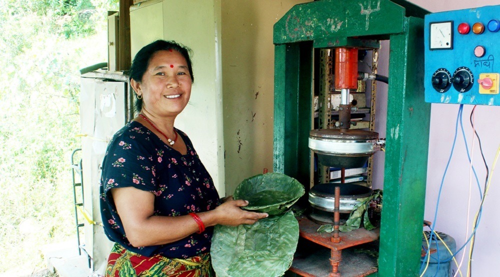 उद्योगबाट स्थानीय महिलाको आयआर्जन वृद्धिमा सहयोग पुग्ने केन्द्रकी परिचालक गीता श्रेष्ठले जानकारी दिनुभयो । “रु दुई लाखमा मेसिन खरिद गरेर उद्योग सुरु गरिएको होे”, उहाँले भन्नुभयो, “फुर्सदको समयमा समूहका सदस्यले जङ्गलबाट पात सङ्कलन गरेर ल्याउने र मेसिनबाट टपरी उत्पादन गर्ने गर्छौँ ।”